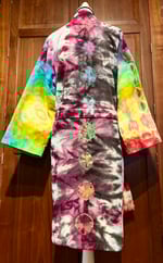 “Intimate Moods” brand, vintage, no size tag. 100% terry cloth cotton. ~54” bust, 30”from pit to bottom seam. 2 front pockets. Adjustable belt. Hand tied & ice dyed with professional dye.
