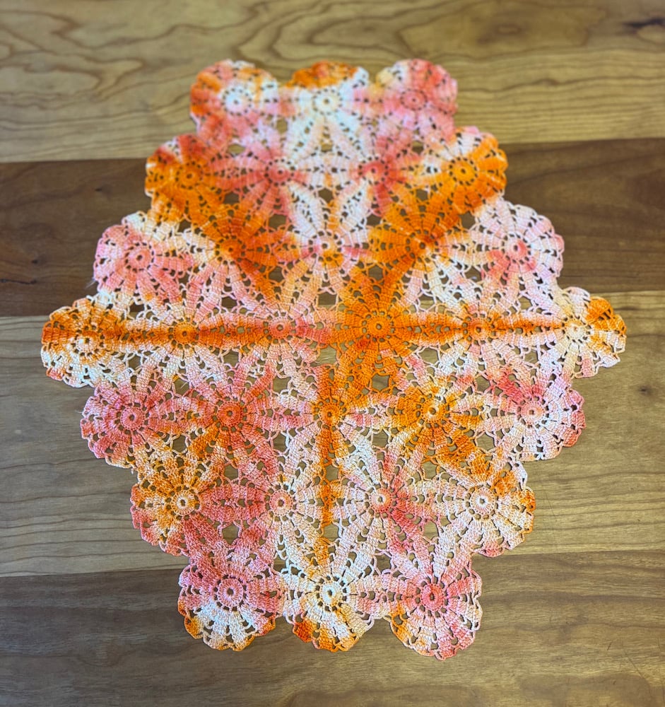 Flamingo Orange Doily - 12.5”x13” - 100% cotton - handmade - crocheted - hand dyed - professional procion fiber reactive dye - upcycled - vintage - ice dyed - Great for a unique pop of color at the dining table or anywhere some upcycled art is needed in your life. Lots of great ways to use linen napkins & doilies, such as a Table centerpiece, sacred altar cloth, hair accessory, wall hanging, quilting or crafting addition, and more!