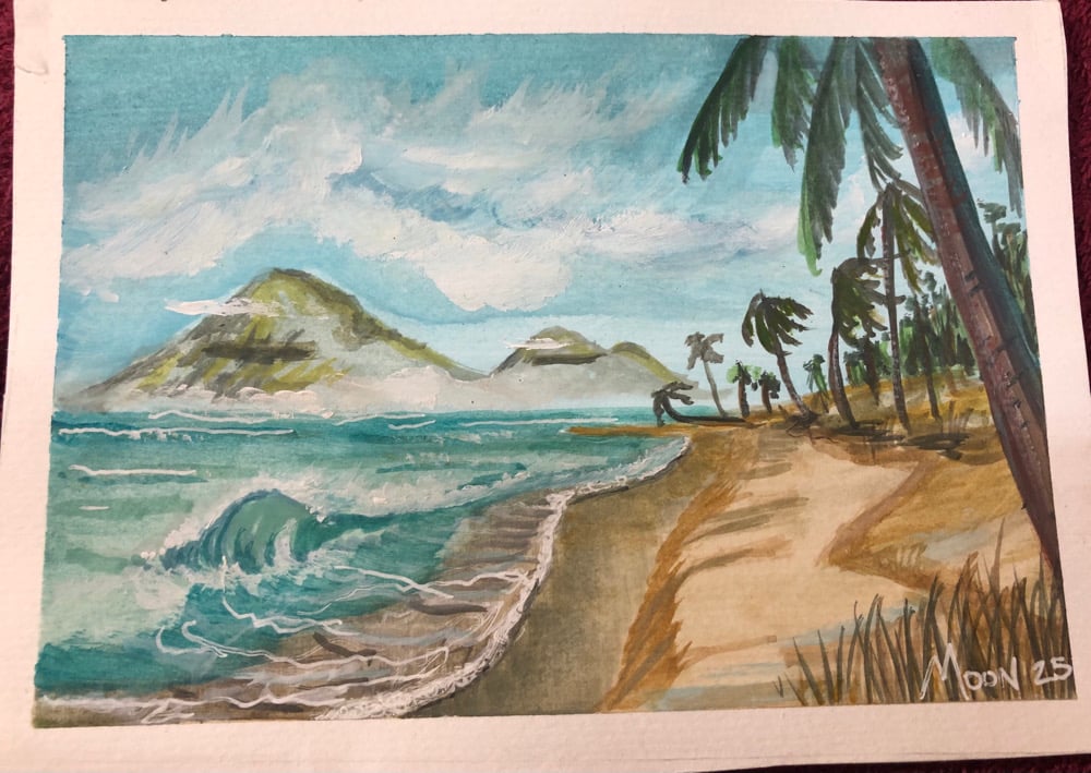 Watercolor of a beach looking like the south pacific ocean. Palm trees and waves caress the sand.