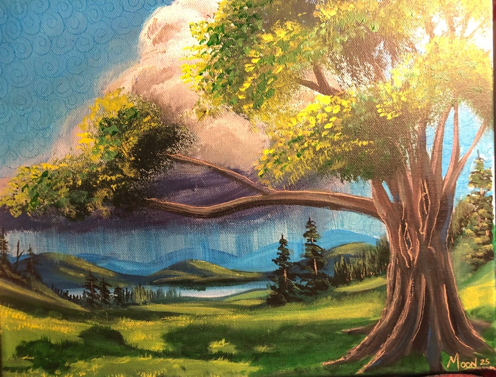 This painting is deep if you take the time to zoom in on all the little details in the distance. A big oak tree standing in the foreground frames the rain falling from the storm cloud. You may feel the wind at your back being pulling towards the storm as nature naturally cools the earths surface.