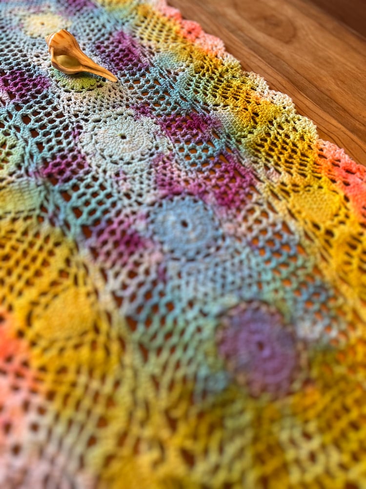 Rainbow Chakra Tablerunner - 11”x38” - 100% cotton - handmade - crocheted - hand dyed - professional procion fiber reactive dye - upcycled - vintage - ice dyed - Great for a unique pop of color at the dining table or anywhere a rainbow is needed in your life. Lots of great ways to use linen napkins & doilies, such as a Table centerpiece, sacred altar cloth, hair accessory, wall hanging, quilting or crafting addition, and more!