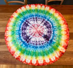 33” Round - 100% cotton - handmade - eyelet design - hand dyed - professional procion fiber reactive dye - upcycled - vintage - ice dyed - Great for a unique pop of color at the dining table or anywhere a rainbow is needed in your life. Lots of great ways to use linen napkins & doilies, such as a Table centerpiece, sacred altar cloth, hair accessory, wall hanging, quilting or crafting addition, and more!