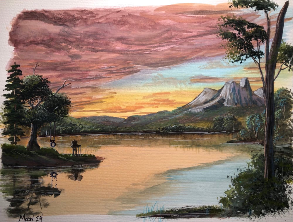 A lone hiker standing near an old tree swing next to a lake and a beautiful view of the golden glow sky. Perhaps its morning and they just finished breakfast before they headed out on trail and stopped to take it in.
