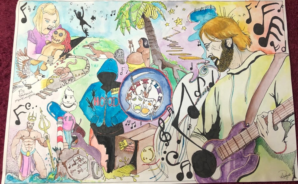 This painting name “Trey Playing Tunes” has 18 songs hidden from his Phish collection. See if you can guess most of them.