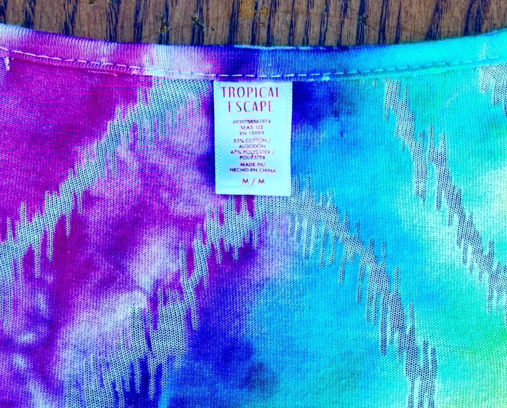 Ethically sourced & thrifted to stay out of landfills. Hand-dyed and ice dyed with professional procion dye.